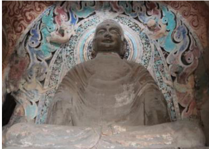 1、大佛洞中心柱正壁主尊佛像。大佛洞中心柱正壁主尊为释迦牟尼佛,结跏趺坐于仰莲须弥座上。佛手缺损。佛像面相丰圆饱满,低垂双目,微抿嘴唇。螺发排列规整,肉髻低平。