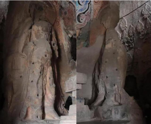 2、胁侍菩萨残毁严重,头部缺失,披帛在腹部交叉,呈“X”形 ,披帛外的璎珞也呈交叉状,腰部裙带自然下垂。右侧胁侍菩萨损毁及其严重,左侧头部和手部残缺,袒露胸部,身体重心放于右腿上,左脚一脚点地,胯部微挺。裙摆褶皱以“曹衣出水”技法表现。