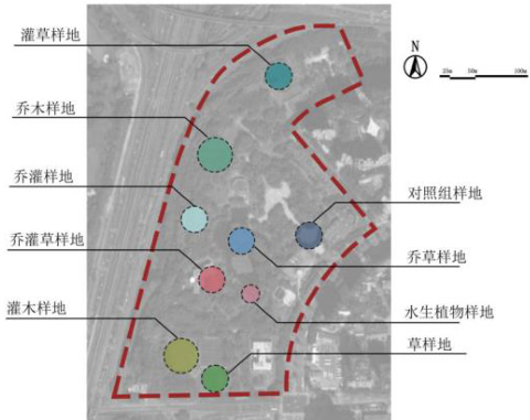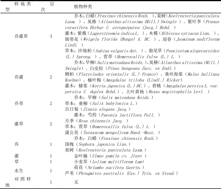 选择北京市望湖公园中的9 种常见植物群落类型,包括:乔灌草、乔灌、乔草、灌草、乔、灌、草、水生、对照,样地植物见表 1。每个样地的大小为 10m*10m,样地的位置选择尽量平均散布于整个公园,增加客观性,防止集中于一处导致数据不合理。