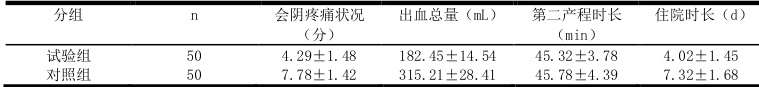 根据下表数据,试验组产妇护理后会阴疼痛状况、出血总量、住院时长以及第二产程时长优于对照组(P<0.05)。