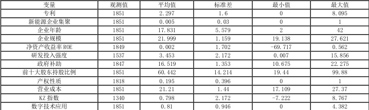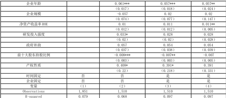 参考现有文献本文选取控制变量主要为企业年龄、企业规模、企业绩效(用净资产收益率 ROE 衡量)、研发投入(研发投入占营业收入比例)、政府补助、前十大股东持股比例、产权性质[15]。