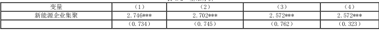 表 4.2 中第(1)列为不加入任何控制变量的结果,第(2)、(3)、(4)列为加入所有控制变量后的结果,且第(3)、(4)列为调整了稳健标准误,聚类到城市的稳健标准误。结果表明,引入控制变量时,新能源企业空间集聚对专利申请数量的回归系数均为正值,且在 1%的水平上显著。这表明新能源企业空间集聚显著促进了新能源企业技术创新产出,假设1 得到验证。