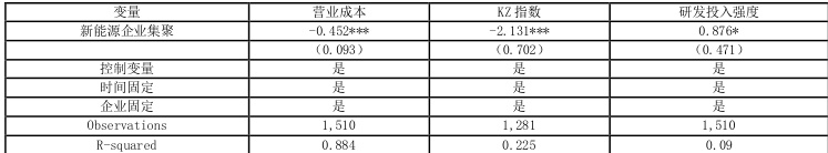 为了探究新能源空间集聚如何促进企业技术创新,选取了企业营业成本、融资约束、研发投入强度三个变量作为中介变量进行机制分析。从表4.4 的结果中不难看出,新能源空间集聚能降低营业成本、融资约束,并提高研发投入强度。以上结果表明研究假设2 成立。