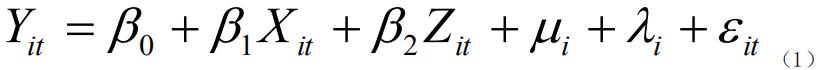 其中,下标i 表示行业,t 表示时间。Y 表示被解释变量即代表新能源企业技术创新产出的专利申请数量,X 表示核心解释变量即新能源企业集聚程度。Z 为控制变量集,其中包括企业年龄、企业规模、企业绩效、研发投入、政府补助、前十大股东持股比例、产权性质。此外,时间固定效应用μᵢ表示,行业固定效应用λᵢ表示,而εit 表示随机干扰项。