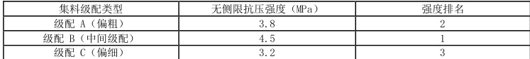在水泥剂量、养生龄期和养生温度相同的条件下,不同集料级配对无侧限抗压强度的影响如表 1 所示。