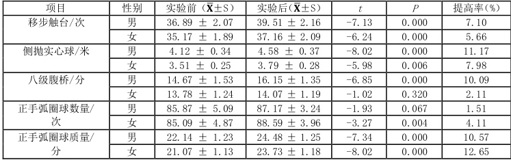通过对实验组与对照组在实验后的身体素质及专项技术测试结果进行比较可以发现,如表6 所示。在身体素质指标方面,实验组男女运动员在移步触台和侧抛实心球成绩均显著高于对照组( P↪0. 001),表明躯干支柱力量训练对灵敏性与上肢爆发力的提升效果更显著。在八级腹桥测试中,实验组男女运动员均显著优于对照组,其中女运动员差异尤为突出( t=9.42 , P<0.001) ),进一步验证了该训练方式在核心力量与稳定性方面的优势。专项技术指标方面,实验组男、女运动员在正手弧圈球数量与质量上均显著高于对照组 (P⟨0,01) 。其中,实验组男运动员在正手的数量和质量上均获得更大提升,说明躯干支柱力量训练使运动员在身体素质和专项技术两方面的提升幅度均明显优于传统力量训练。