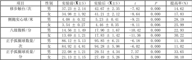 对实验组进行实验前后配对样本t 检验,结果见表5。经过为期12 周的躯干支柱力量训练,实验组在身体素质各项测试中均有显著提升 (p<0.01) )。其中侧抛实心球和八级腹桥提高显著,同时正手弧圈球的击球数量和质量也有显著提升,说明核心力量的增强有效提升了击球的稳定性和质量。