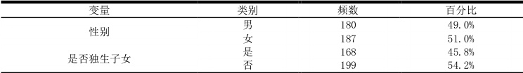本研究采取整体随机抽样,选取扬州市某小学六年级的学生,使用问卷星进行调查,共计371 名学生参与,剔除极端数据和无效数据问卷后保留367 份,有效回收率为98.92%。其中男生(180 名),女生(187 名),是否是独生子女(是:168 否:199)。