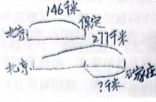 但有个别同学在前面的画图基础上会有如下画图,经过学生讨论交流用两段表示不合理,北京到保定是北京到石家庄的一部分,可以直接画在一条直线上比较方便、简洁 ,从而引出用线段图画图法,通过讨论、比较发现线段画图的方法,并且总结,在画图时不仅关注数量关系,而且关注数据大小与线段长短之间合理性的关系。