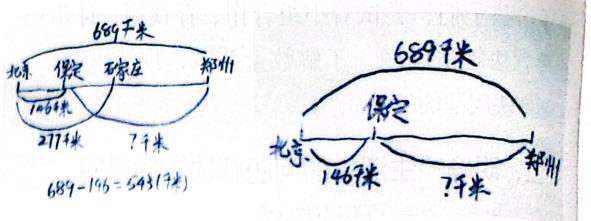 教材呈现的三个问题:问题1“保定到石家庄有多少千米?画一画,说说你是怎么想的”求的是相邻两站之间的里程;问题2“保定至郑州有多少千米?在上图中画一画,算一算”求的是不相邻两城市之间的里程;问题3“813-689 求的是哪两个城市之间的里程?问题依次推进,由易到难,学生的问题解决能力在说、标、画等过程中初步建立起来,最后学生借助画一画理解问题,解决问题,找到解决问题的方法---画图。三个问题层层递进,从解决相邻两城市的里程到不相邻的两城市里程,从先看懂图到主动画图,实现思维的质变,把抽象的数学转化成直观的示意图或线段图,经历画图分析问题、解决问题的过程,提高学生获取信息的能力,增强学生画图分析问题、梳理问题的能力,培养学生的应用意识。