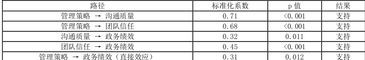 中介效应检验(Bootstrap 5000 次)显示沟通质量和团队信任的中介效应均显著(95%置信区间不包含0),进一步验证了H4。