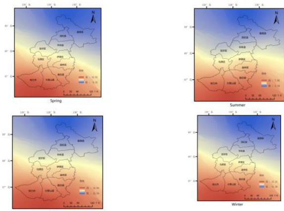 通过分析近 20 年伊春市地区 500hPa 高度层的气象数据可知,该高度平均风速为 9~12m/s ,主导风向为西北风,表明西北风是该区域高空大气环流的重要特征之一,自西南朝向东北方向,随着地理位置的改变,风力强度逐渐减弱。而在距地100 米高度的平均风向则具有显著的规律性,主导风向为南风及偏西南风,表明该区域受特定大气环流系统影响,使得来自南向及西南向的气流在该高度层上占据优势地位。在风速方面,呈现出明显的空间差异,汤旺县表现最为突出,风速明显高于周围县区;以中部地区作为核心区,可以发现风速由中心向东西两侧递减。