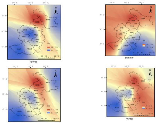 图3 2005—2024 年伊春市100m 高度四季平均风矢量空间分布