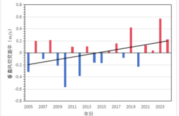 通过研究发现,在近 20 年的观测周期内,林都机场垂直风切变距平有 9 年呈现负值状态,表明垂直风切变距平的实际观测值低于其长期平均水平,反映出当时的大气垂直运动可能较为平缓,风速在垂直方向上的梯度变化相对较小;其他年份则呈现正值,表明垂直风切变距平高于平均水平,代表大气垂直方向上的风速变化较为剧烈。从整体来看,风切变距平呈现出明显的上升态势,表明风速在垂直方向上的梯度有增大的趋势,风速的垂直运动总体上是增强的。2020 年以前,风切变距平的振荡周期稳定在 1~2 年,呈规律的周期性变化,2010 年和 2023 年年际变化幅度较大,为近20 年来的峰值。