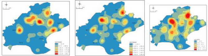 核密度分析是一种非参数统计方法,用于估计地理空间内要素集聚程度,通过计算点周围特定带宽内的要素密度生成连续热力图,以颜色深浅直观反映空间疏密,深色代表高值集聚热点。本文基于 ArcGIS 软件,利用嘉兴市专精特新企业经纬度坐标,绘制2022-2024 年核密度分布图(图1)。