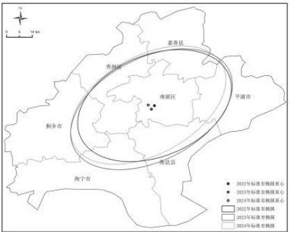从时空演化看,三年间椭圆重心始终在南湖区,经纬度偏移量分别不超 0.03°和 0.02∘ ,核心区域稳定性极强,这与南湖区作为嘉兴政治、经济、文化中心的地位相符。椭圆覆盖范围整体稳定,面积波动在 5%以内,空间格局连贯,与‚十四五‛‚一核两翼‛战略相关。