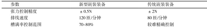 采用新型安装装备能明显改善线拉伸控制精度,能更加精确控制线圈拉伸量,能更好地控制安装质量。由于排线速度大大提高,极大缩短了安装时间,能大大提高生产效率。对槽位填充率控制界线明确,有利于电动机高密型和高效型[5]。相比传统安装设备,新型电机绕组安装要求,上述主要参数都存在明显的不足,无法达到新标准。
