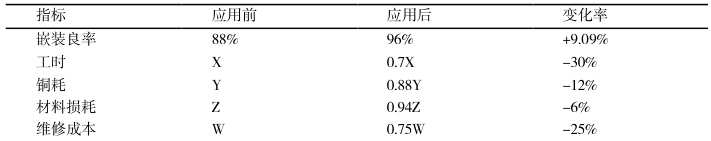 通过对企业实际试验后得出的结果来看,实施新型电动机线圈和安装方式后各项性能数值均有提升,优良的安装率从原先的88%提高了 96% ,有效降低了不良率的出现概率,进而大大提升了生产效率。节约工作时间30%,降低了制程时间,减少用工量。电力消耗减少 12%,电动机效率提高了,同时也减少了电能消耗。在成本方面,新型电机绕组与安装技术减少了6%的耗料成本,这是由于其绕组与安装的技术路线更加成熟、精准,更注重节约使用资源,并能够避免大量浪费;减少了25%的检修成本,说明此款电机更加耐磨耐用并具有更加良好的稳定性,从而能够降低今后修磨的成本;总的来说,此款新型电机绕组与安装方法具备较高的经济效益潜力及极大的市场普及潜力。