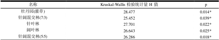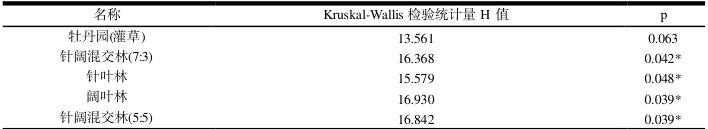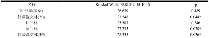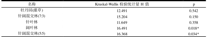 根据正态性检验结果,数据不满足正态分布,因此使用非参数性检验,对比所有样地与对照组的差异,非参数检验结果表明,样地阔叶林、样地针阔混交林(5:5)和样地针阔混交林(7:3)对比对照组具有显著性差异。牡丹园(灌草)、针叶林样地间空气负离子平均浓度对比对照组没有显著差异。