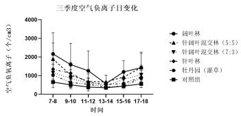 在空气负离子浓度的日变化方面,春、夏、秋三个季节都表现出单谷变化的趋势。具体而言,空气负离子浓度在白天呈现先下降后上升的变化。时间上,上午 8:00-14:00 为城市森林各样地空气负离子浓度的下降期,中午 13:00-14:00 前后达到一天中的最低值,随后下午 14:00-18:00 空气负离子浓度开始上升。在季节变化方面,夏季各样地的空气负离子浓度最高,秋季次之,而春季浓度最低。