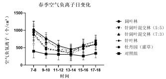 春季空气负离子浓度在不同森林群落结构样地中由高到低的排序为:阔叶林(平均663个/cm3) >针阔混交林(5:5) (平均648个/cm3) >针阔混交林(7:3) (平均 585个/ cm3)>针叶林(平均 622个/cm3) >牡丹园(灌草) (平均 536 个/cm3)>对照组(平均 350 个/cm3)。总体趋势表现为阔叶林>针阔混交林>针叶林>灌草。