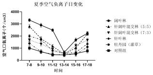 夏季空气负离子浓度在不同森林群落结构样地中由高到低的排序为:阔叶林(平均 2221 个/cm3) > 针阔混交林(5:5) (平均1587 ↑/(rm3)> 针阔混交林(7:3) (平均 1231 个