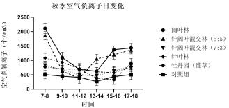秋季空气负离子浓度在不同森林群落结构样地中由高到低的排序为:阔叶林(平均 1228 个/cm3) >针阔混交林(5:5) (平均1085 个/cm3) >针叶林(平均 784 个/cm3) > 针阔混交林(7:3) (平均 648 个/ cm3)>牡丹园(灌草) (平均 632 个/cm3)>对照组(平均433 个/cm3)。总体趋势表现为阔叶林>针阔混交林>针叶林>灌草。
