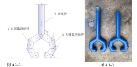 左右圆弧消能管分别由四节DN40 管道切割组合而成,切割后打磨毛刺,焊缝连接。左圆弧消能管,Z1 号块切割角度为 90°、Z2 号块切割角度为115°、Z3 号块切割角度为110°、Z4 号块切割角度为120°,右圆弧消能管切管方式雷同。切割完成后需对毛刺进行打磨,打磨后进行焊接作业,焊接与泄水管焊接。