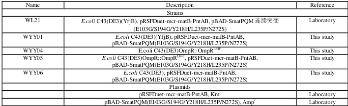 5)制备双交换菌株及 C43(DE3)感受态,共转化质粒 pBAD-SmatPQM 连续 5 个突变及质粒 pRSF-mcr-matB-pntAB;