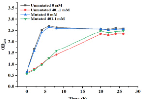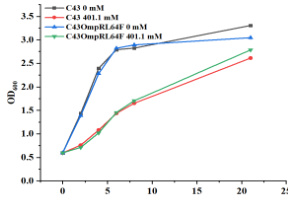 研究表明:在401.1mM 高浓度丙二酸盐的条件下,突变菌株适应性较强,表明E.coli C43 基因组 0mpR∣β+∣ 位点突变对菌株的丙二酸盐耐受有正向作用。