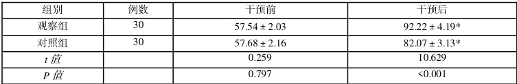 干预后观察组高于对照组(P<0.05)。见表 2。