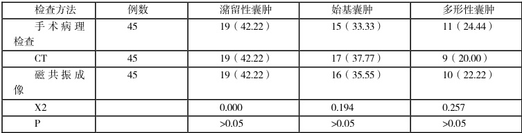 病理诊断显示,19 例为潴留性囊肿,15 例为始基囊肿,11 例为多形性囊肿。CT 检查方面,19 例潴留性囊肿全部正确诊断,准确率达 100%;在诊断其余 26 例非潴留性囊肿时,出现 2 例误诊,均是将多形性囊肿错判为始基囊肿,综合来看,CT 检查的整体诊断准确率为 96.00% ;磁共振成像检查时,19 例潴留性囊肿同样实现精准诊断,准确率 100% ;在 26 例非潴留性囊肿诊断中,仅 1 例多形性囊肿被误判为始基囊肿,其总体诊断准确率更高,达到 98.00%c
