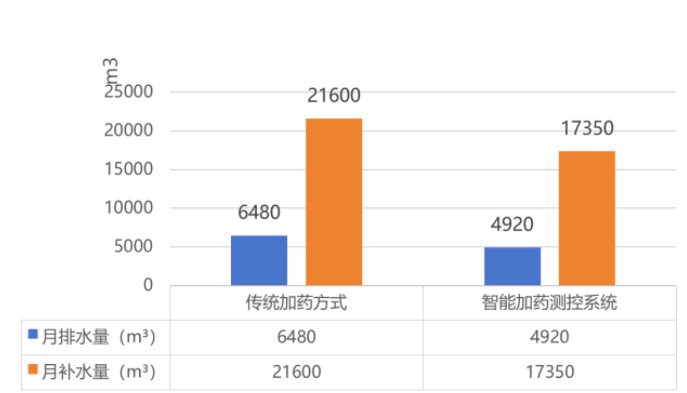 智能加药测控系统在排补水控制方面也表现出明显的优势。月排水量减少了 24.1% ,月补水量减少了 19.7%c 。这是因为智能加药测控系统能够有效控制循环水的水质,减少了因水质恶化而导致的排补水次数和水量。