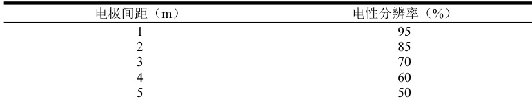 提高电性分辨率是高密度电法优化的关键之一,提高电性分辨率,可以采用更精细的电极布置方案和增加测量频率的手段。借助先进的电性模型和算法优化,可以提高电性分辨率,提高深层探测的分辨率。不同电极间距对电性分辨率的影响如表 1 所示。