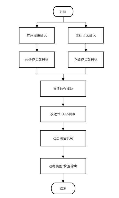 算法设计以 YOLO 模型为基础进行改进,重点解决小型动物识别精度低和误报率高的问题。针对热成像与雷达点云数据的特性,设计双通道特征提取网络:热成像通道负责捕捉动物的温度分布特征,利用红外图像中动物与环境的温度差异增强目标显著性;雷达点云通道则提取目标的三维空间位置、运动速度等信息,弥补热成像在复杂背景下的识别不足。
