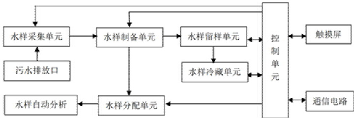 本设计系统在工作时,模拟量输入单元将采集到的数据传送给控制单元,并判断是否达到采样标准。进行采样时,水样采集单元初步采集水样至水样制备单元,然后向水样分配单元供样。当水样超标时,启动水样留样单元将采集到水样送至留样瓶并冷藏保存。系统的采样参数可以通过触摸屏进行设置。相关采样数据经过RS485、RS232 通信电路将数据传输至数据采集仪,相关管理部门及检测平台的工作人员可以通过登录数据中心,实时掌握水质的变化情况。