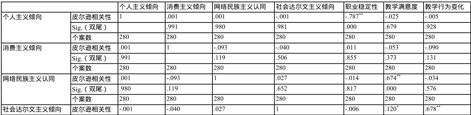 相关分析的目的是查看变量之间线性相关性。下表展示了个人主义倾向、消费主义倾向、网络民族主义认同、社会达尔文主义倾向、职业稳定性、教学满意度、教学行为变化这七个变量之间的相关系数(Pearson Correlation)和显著性水平(Sig.双尾)。