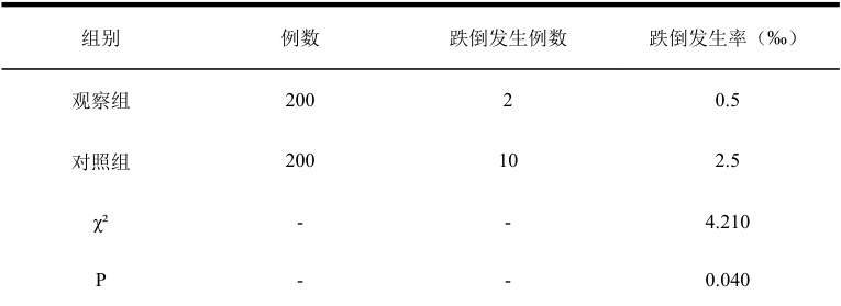 表1 两组跌倒发生率比较