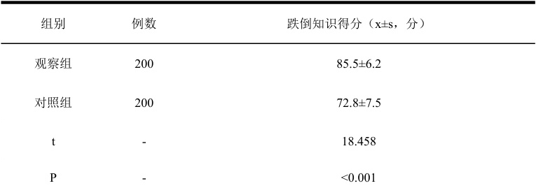 观察组患者跌倒知识调查问卷平均得分为(85.5±6.2)分,对照组患者跌倒知识调查问卷平均得分为(72.8±7.5)分。两组患者跌倒知识得分比较( (P<0.001) )。详见表2。表2 两组患者对跌倒知识的掌握程度比较