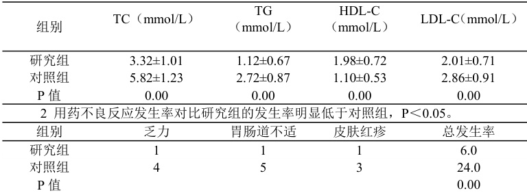 结果:研究组HDL-C 水平较对照组升高,其余血脂水平均低于对照组, P<0.05∘