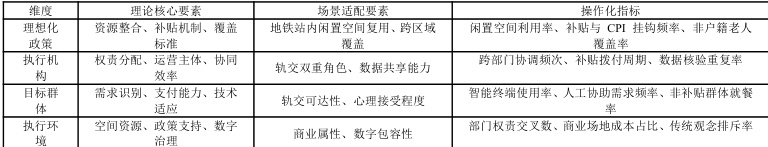 既有研究可归纳为三条线索。一是关于执行主体的研究。薛在兴将助餐模式划分为政府主导、市场驱动、社会协作、多方共建四类,但未深入探讨不同主体间的权责分配与激励相容问题[8];刘太刚发现非营利组织在助餐链条中存在“功能悬浮”,但对政府与市场间的缝隙填补不足[9]。二是关于目标群体的研究。邓婷鹤等基于北京 73 家助餐点的数据表明,数字系统虽提升效率,却加剧了老年群体的“技术排斥”,这发现对地铁高数字化场景具有直接启示[10]。三是关于环境约束的研究。黄骁然运用空间分析技术指出,助餐设施与老人需求存在空间错配[11];饶晶基于史密斯模型验证政策环境对黄石市助餐绩效的显著影响,但未涉及商业综合体或轨交枢纽的特殊环境变量[12]。