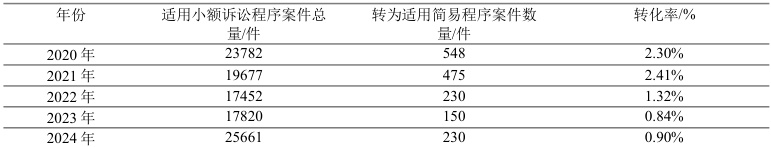 尽管小额诉讼程序向简易程序的转化率有所降低,表明小额诉讼程序的适用更为准确、规范,但程序转化标准不明晰的问题依旧未能得到彻底解决。在中国裁判文书网所公布的那些涉及程序转化的裁判文书中,很少有对程序转化的具体原因进行明确且详细的说明,多数情况下,转化原因仅简单表述为“因案情复杂,依法适用简易程序”。这样模糊的表述使得程序转化的标准仍然存在较大的模糊空间,不仅不利于当事人理解程序转换的依据,也可能影响司法程序的透明度和公信力,这一问题仍有待在后续的司法实践和制度完善中加以解决。