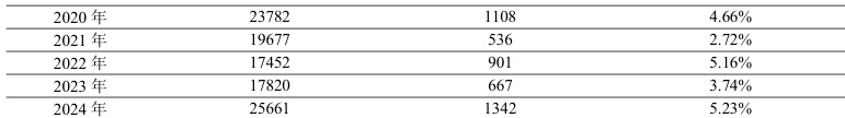 为精准把握这一现象的具体态势,本次研究进一步以江苏省基层人民法院2020-2024 年间小额诉讼程序转化为简易程序的案件作为分析样本,通过对裁判文书中程序转换的原因、数量、比例等关键信息的提取与统计,形成了表3(江苏省基层人民法院小额诉讼程序转为简易程序转化率统计)。该表格数据不仅能够直观呈现程序转换的年度变化趋势,还为深入分析转换背后的制度诱因、司法实践困境以及优化案件分流机制提供了重要的实证依据。