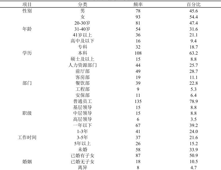 在酒店管理人员的帮助下,采用分发的形式,对酒店的在职员工进行了问卷调查。共发放问卷 210份,回收179 份,回收率为 89.5% ,剔除无效的问卷,有效问卷还剩 171 份,有效率为 95.5% 。本文使用SPSS20进行数据分析,首先,运用对样本进行描述性分析,然后对量表的信效度进行检验,最后利用SPSS20通过 KMO 和Bartlett 的球形度检验、方差分析来考察不同人口样本的员工职业倦怠水平及影响职业倦怠水平影响因素。