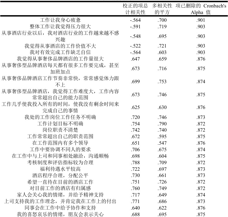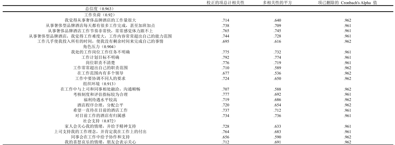 首先分变量信度社会支持(0.872)、组织环境(0.913)、角色压力(0.904)、工作负荷(0.92)均大于0.8,其次所有题项删除之后整体问卷的信度会出现下降的情况,也即小于问卷总信度 0.963。同时问卷各题项之间的相关性均大于0.6,也即问卷各题项一致性相对较高。