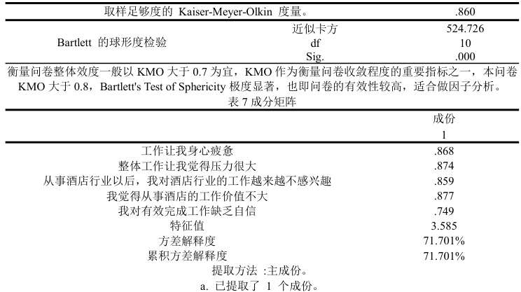 由于职业倦怠仅能提取一个主因子,因此仅有成分矩阵无旋转成分矩阵。首先特征值3.585 大于1,方差解释度及累积方差解释度均大于 70% ,说明职业倦怠问卷收敛效度较好。