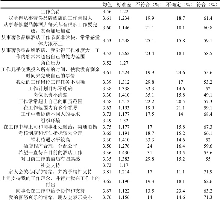 整体上受调查样本男女虽然出现一定的偏倚,但是符合一般酒店业女性从业者居多的现象,年龄分布上中青年为主,整体受教育水平较高,集中于业务部门多为普通职员,具有较长的工作时间,因此整体受调查者的样本可信度较高。