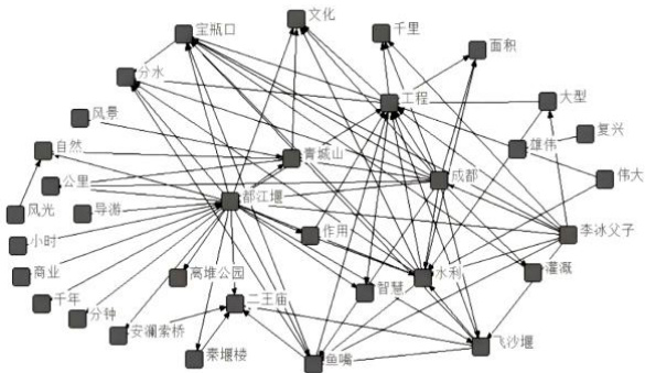 语义网络分析显示,共现关系主要集中在都江堰、青城山、水利工程、成都四个核心词汇。这表明都江堰景区与青城山及成都之间联系紧密,形成了协调的区域旅游生态,为游客提供了完整多样的旅游体验。