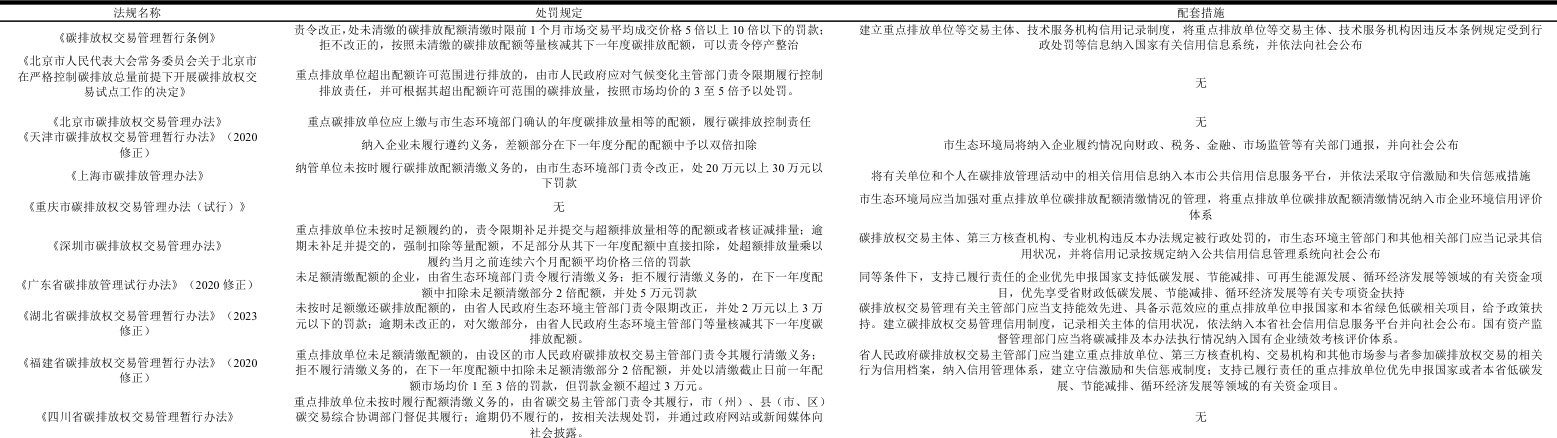 第四,地方惩罚差异显著导致惩罚力度不均和权力腐败滋生等问题。自碳交易市场建立以来,中国已设立九个区域性碳排放权交易市场,分别位于北京、天津、上海、重庆、湖北、广东、深圳、四川以及福建。尽管《碳排放权交易管理暂行条例》明确指出中国将不再新建地方碳排放权交易市场,但这些已有的地方市场仍在运行。但从当前各地方碳交易市场的处罚制度来看重点排放单位的市场履约成本与惩罚水平并不对称,同样对于排放单位配额未清缴且 度配额中未足额清缴部分的 2 倍配额,湖北省、四川省在下一年对碳配额进行等量扣除, 固定罚款方面,规定对违约单位处 20 万元以上30 万元以下罚款,福建省则规定罚款金额 从博弈论角度来看,“在成本高于边际罚金情况下会出现道德风险等问题, 从而 制设计,不仅要持续完善国内立法和碳核算等制度性基础设施,还需要加快探索 罚制度在国家层面的统一性和权威性 16。参考文献: