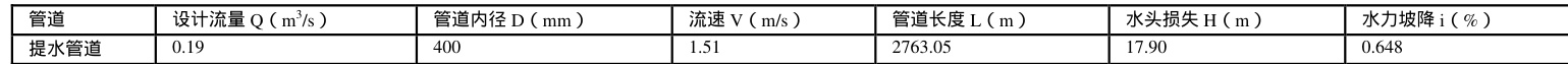 该工程供水管道采用钢管。钢管道的粗糙系数 ΠΠΠΠΠΠ 值取决于其内壁防腐的做法,按照水泥砂浆内衬的金属管道的内防腐做法,其粗糙系数为 n=0.012c 。局部水头损失按沿程水头损失的10% 计算。经过多次计算比较,提水管道采用 DN400 钢管,设计流量 Q=0.19m3/s ,总长2763.05m ,到管道终点,管道水力参数见表 2
